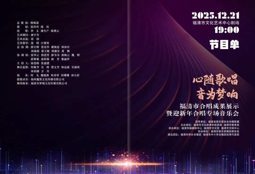 歌声是时光的注脚,也是梦想的回响。本次音乐会既是福清市合唱艺术发展成果的集中检阅,更是文旅惠民的暖心实践,众多优秀合唱团队将以歌为媒,串联起岁月的温情与对新年的憧憬。